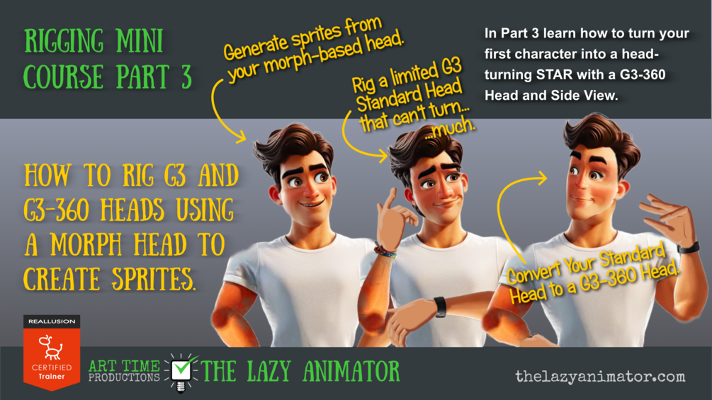 In the third part of my Easy Character Rigging series you'll learn how to use your character's morph-based head to generate all the sprites you need to create a fully rigged G3 Standard head. I'll then show you how to convert your standard G3 Head into a standard G3-360 head with the ability to look left and right and still look great!