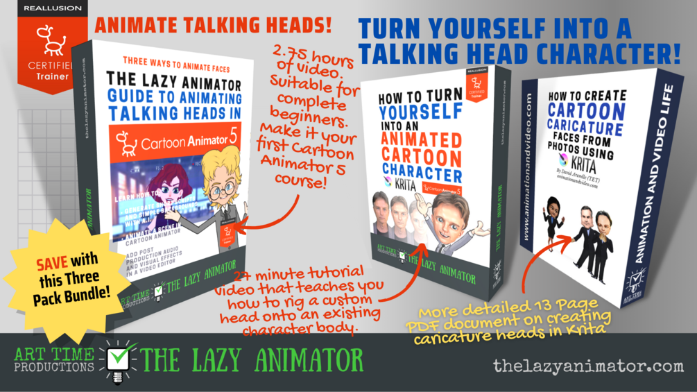 Everything you need to make fun, animated parodies of you and your friends for social media shorts or long form animated vlogs in my Animate Talking Heads Bundle. Get two extra tutorial packs for just an extra US$10.00 - less than the price of each if bought individually!
