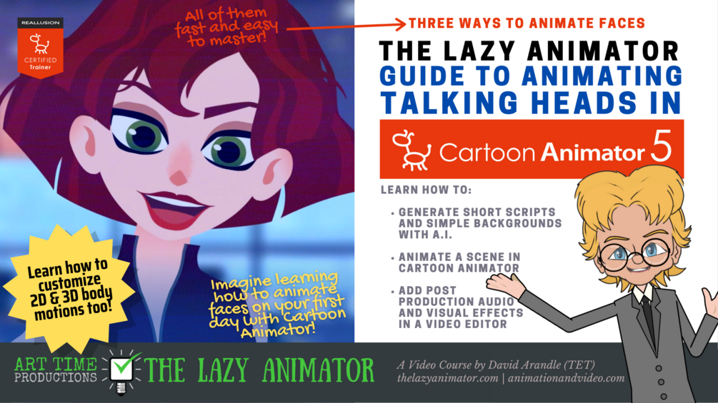 Learn how to animate an entire scene from script, to Cartoon Animator, to Video Editor, to finished Animation. Along the way you'll learn three different methods to quickly animate a talking head (and upper body) so you can complete quick animated shorts in hours rather than days.
